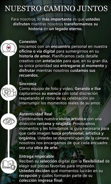 Con cada imagen, no solo documentamos, sino que creamos recuerdos que laten con la misma intensidad que los corazones que celebran. Nuestra meta es simple: transformar tus instantes más íntimos en una eternidad palpable.